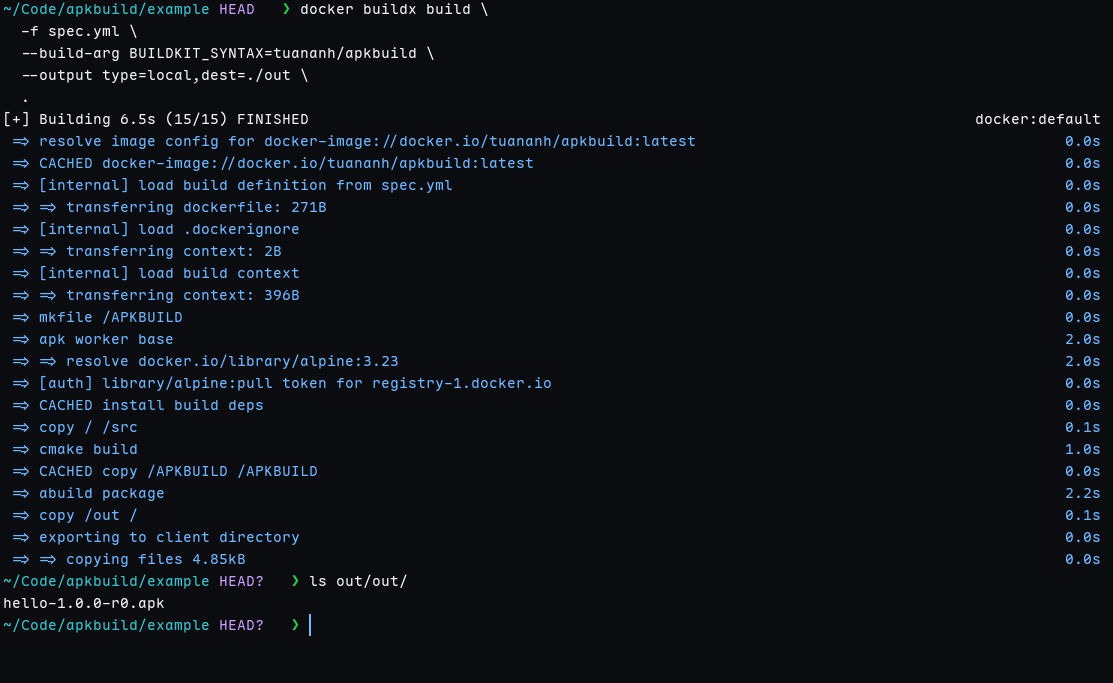 That’s it. No Dockerfile. No shell scripts. BuildKit reads this spec through the custom frontend and produces a .apk file.